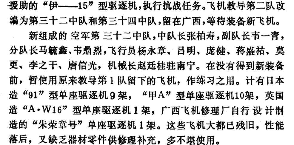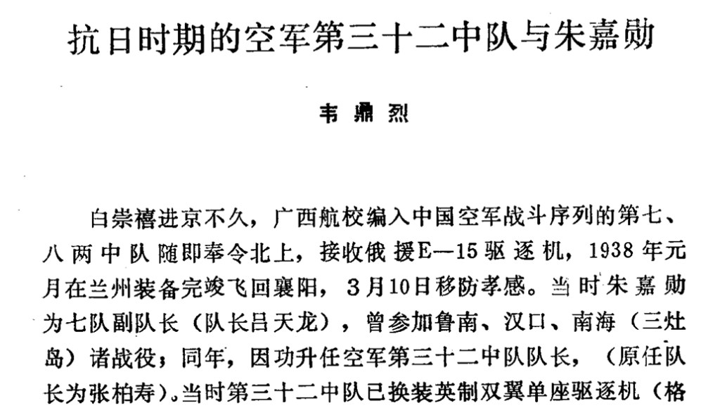 记录三:同一文献中韦鼎烈(广西航校一期,32中队分队长、副队长,韦鼎峙族兄,战后赴台)的另一文章提到了38年7月的一些作战部队人事变动:原七中队副队长朱嘉勋因功升三十二中队长,接替张柏寿。