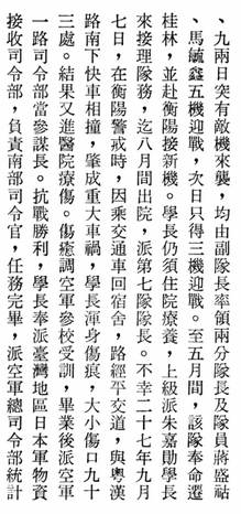 广西空军在粤湘赣一带负责粤汉、湘桂铁路空防时,遭到过一次惨重的非战斗减员,即38年9月7日空袭警报解除之后,二十余人在夜色中乘车由机场返回宿舍,被粤汉线南下快车迎头撞上,全车非死即伤。我看到黄昌琳所写的这里已经完全晕的,张将军他为什么8月初在住院,中间也没有参加空战,9月又进去了,但好像9月这次住院是因为7日的车祸,和之前又不相同。