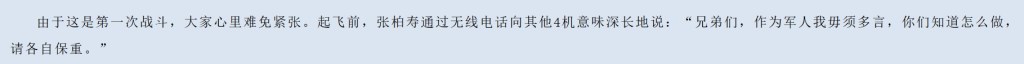 ……由于这是第一次战斗,大家心里难免紧张。起飞前,张柏寿通过无线电话向其他4机意味深长地说:“兄弟们,作为军人我毋须多言,你们知道怎么做,请各自保重。”