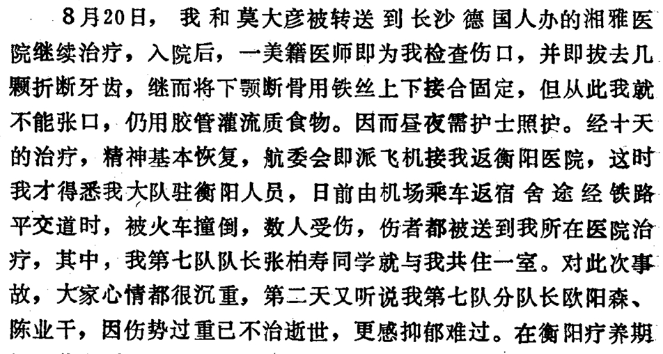 记录五:七中队副队长黄昌琳在8月18日这场衡阳空战中下巴被子弹击穿,满口牙齿全被打落,重伤送至长沙治疗,好转后才回衡阳,在住院当中,竟然又遇到了张柏寿: