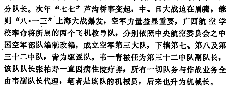 以及同一篇文章中韦一青(32中队副队长,后升为中队长,1939年阵亡)部分有说: